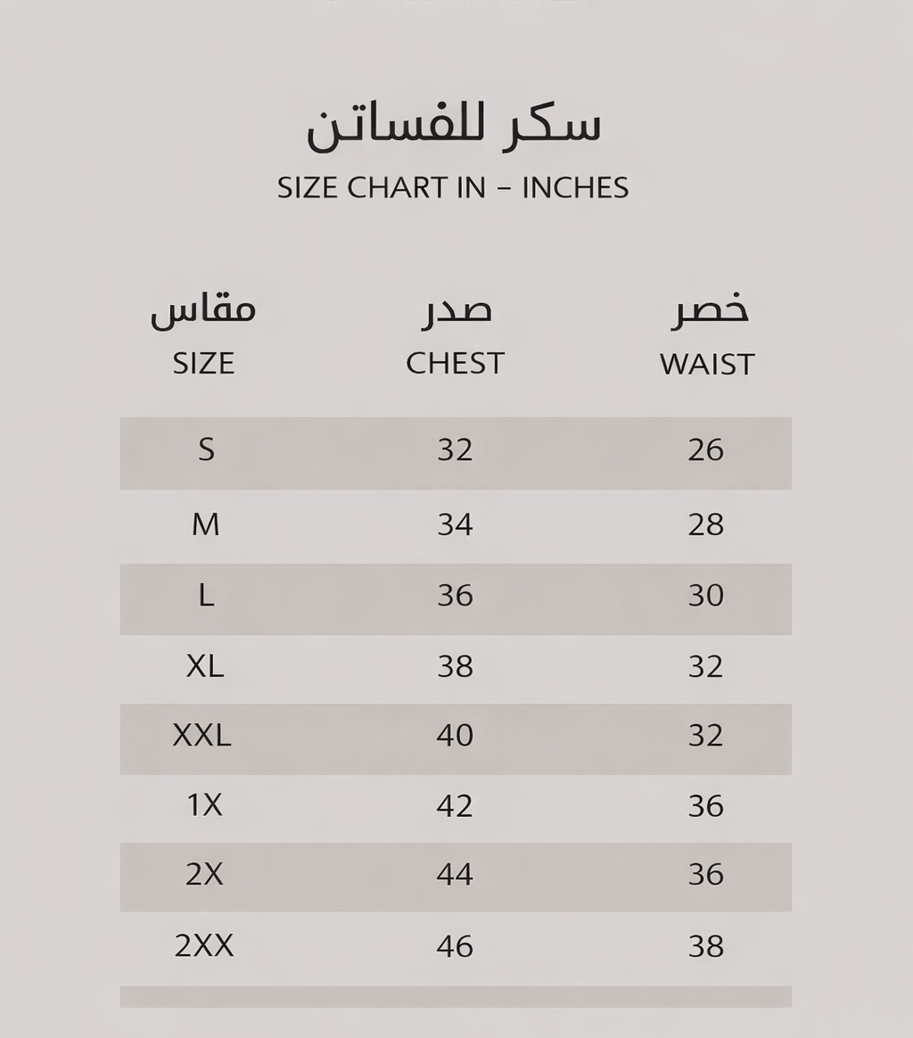 إخلاء مسؤولية/ يرجى ملاحظة أن المقاسات الموضحة على المنتجات لدينا هي مقاييس إرشادية مستخدمة بشكل عام، ولا يمكن أن تكون مُوحدة على كل الملابس بسبب اختلاف الخامات والموديلات والتصميمات. وللاستفسار اكثر يرجى التواصل معنا على واتس اب: +966530447774